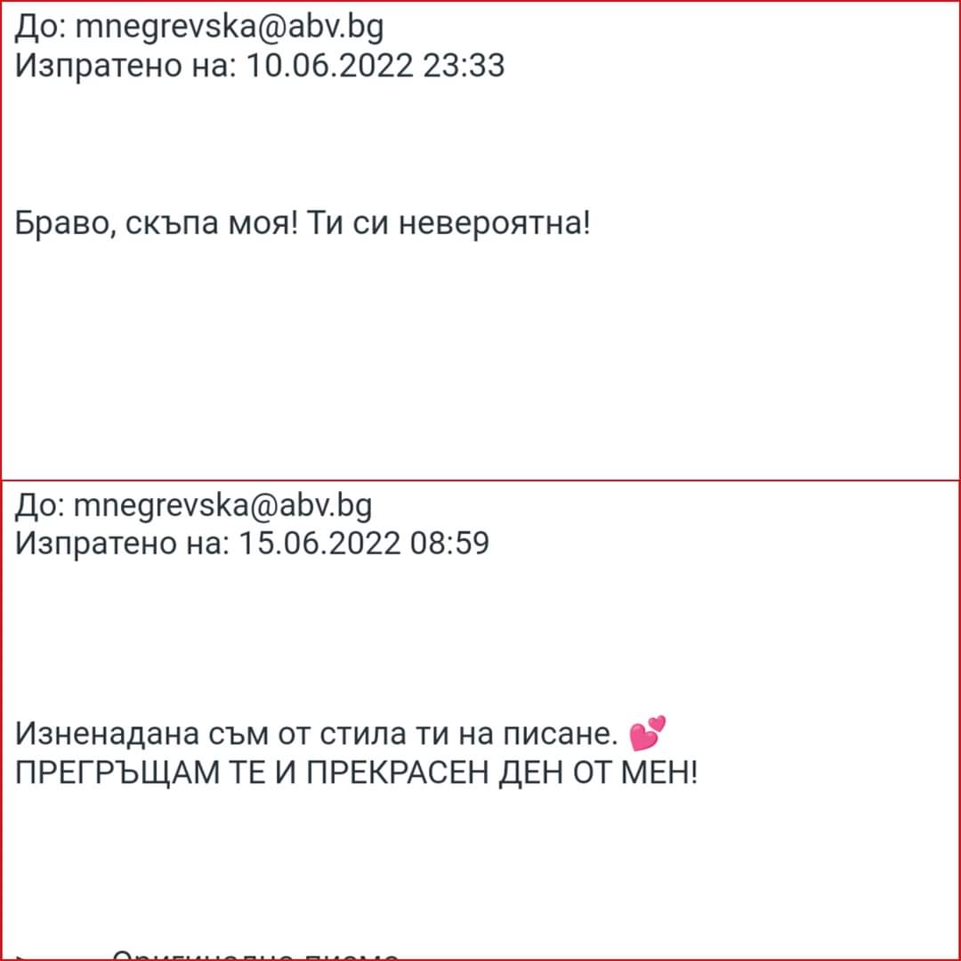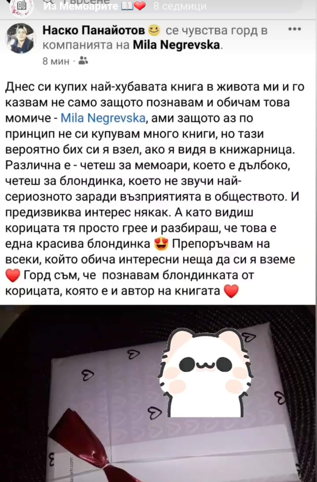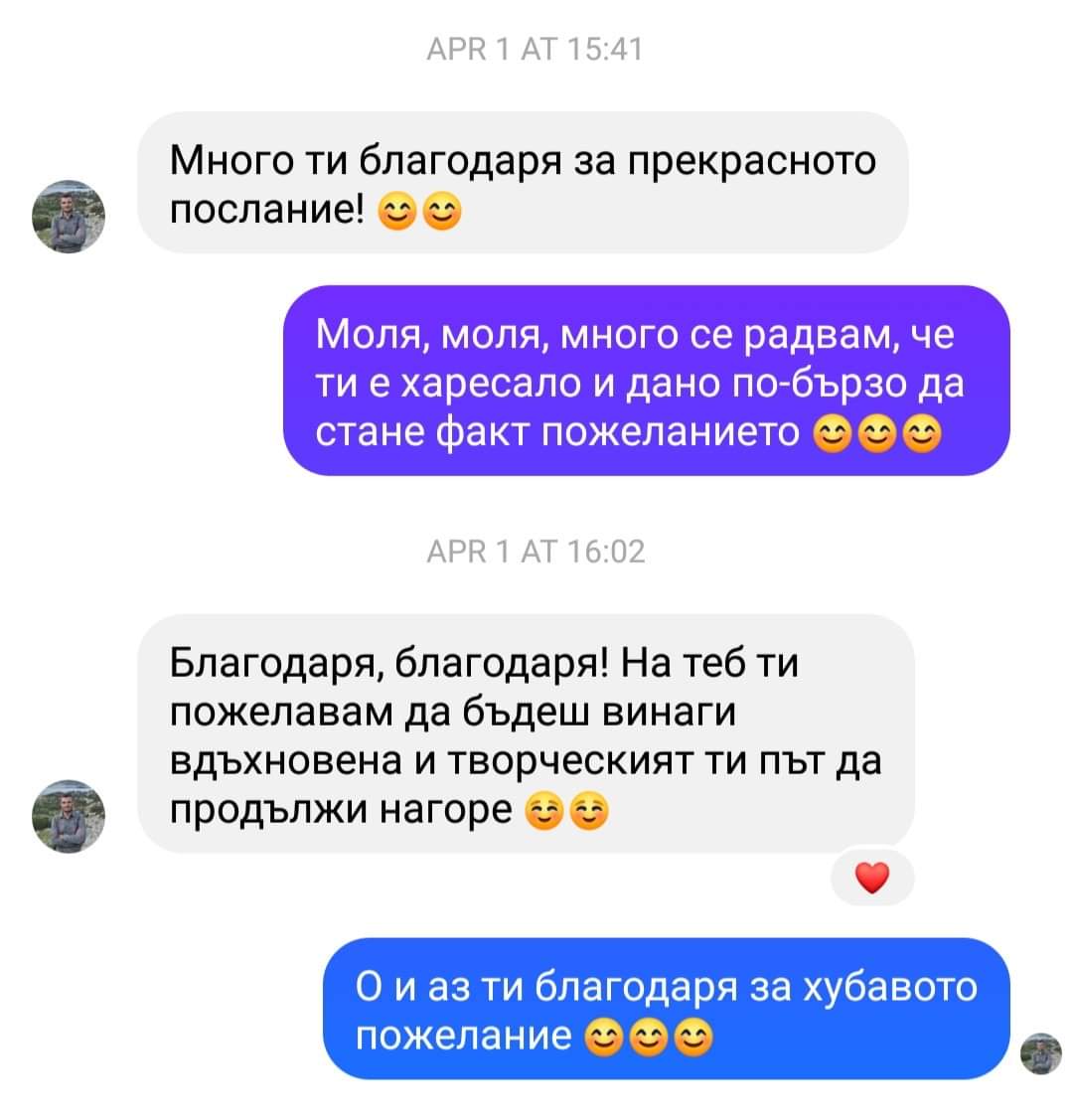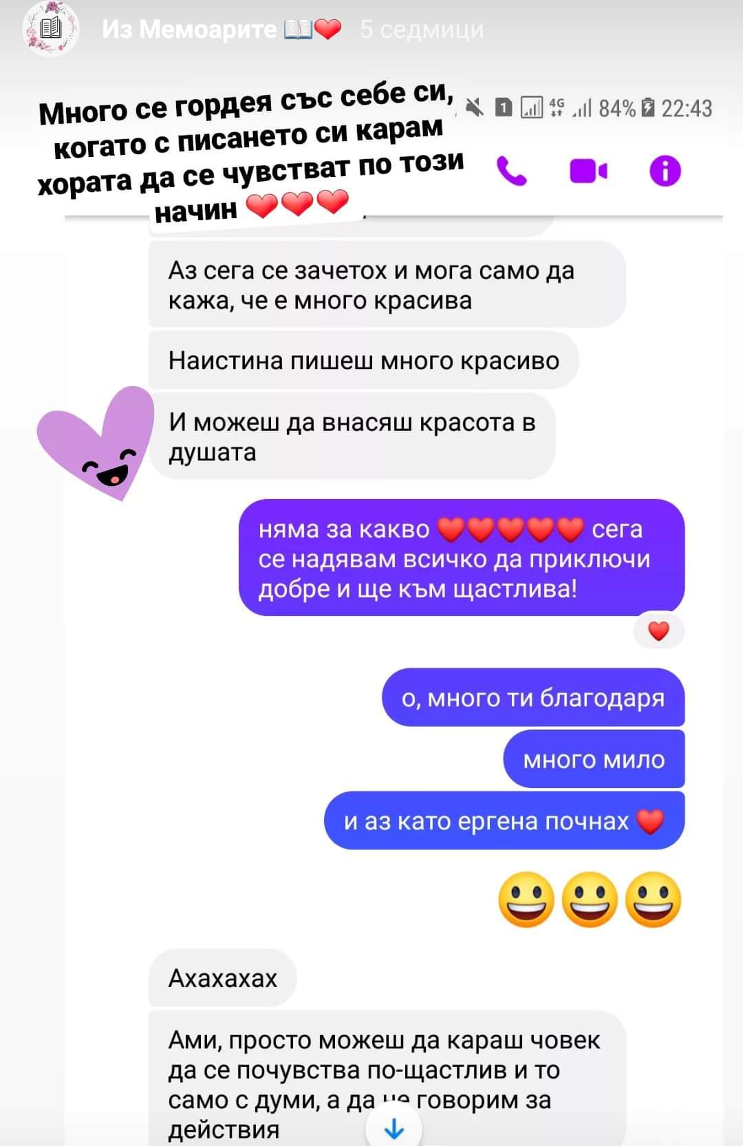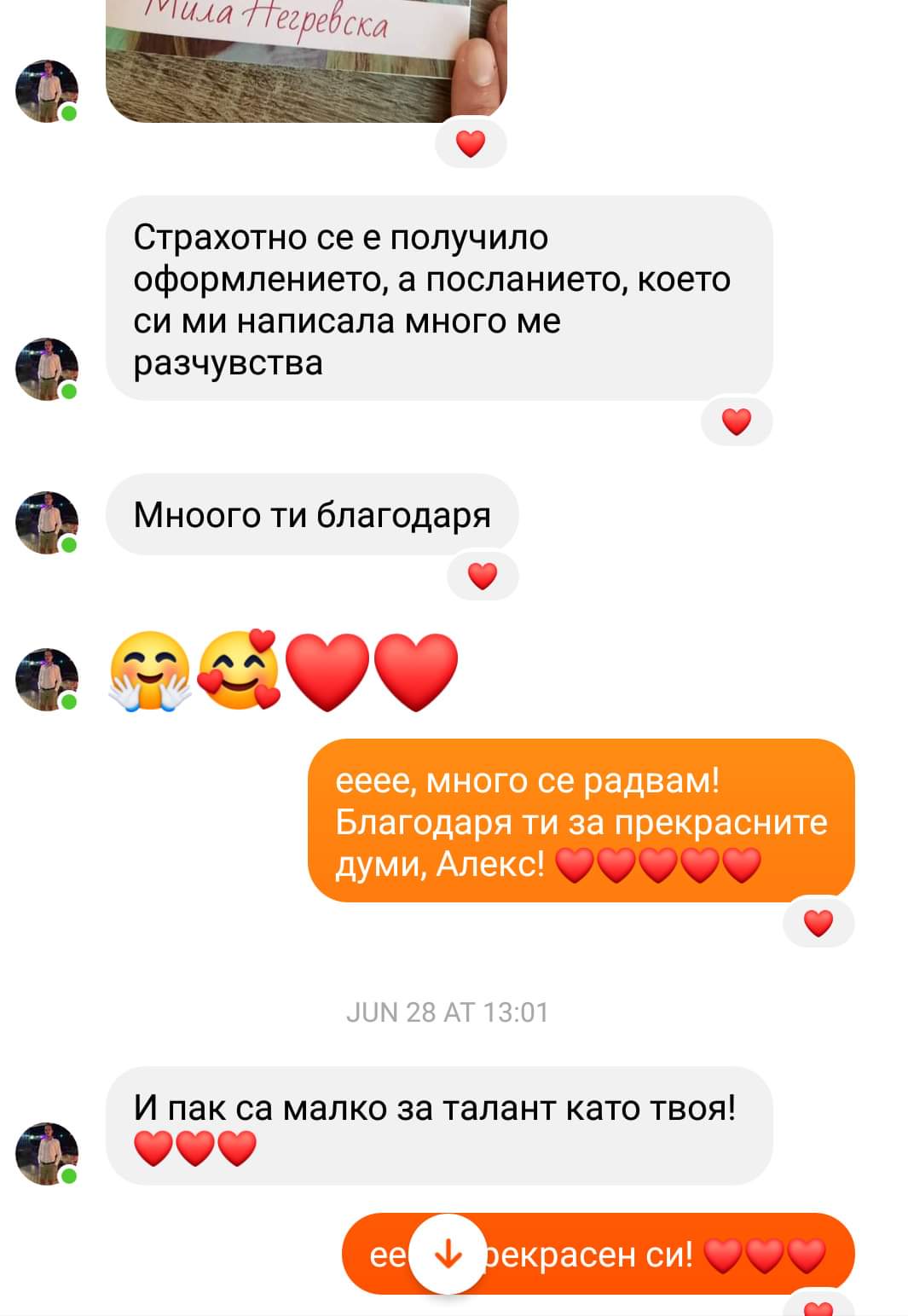 Получих толкова прекрасни коментари и съобщения като обратна връзка от вас. Честно, не го очаквах! Мислех си, че в много голяма част от емоциите си няма да бъда докрай разбрана, че не всеки ще ме усети и ще хареса книгата, съответно. Но не беше така – имаше хора, които дори не са ме виждали на живо и ми писаха прекрасни думи. Гордея се със себе си, заради това. Ще пусна някои от прекрасните ви съобщения, които ме вдъхновяват всеки път, когато си ги препрочитам. Вдъхновяват ме да не спирам и да пиша и да творя и да издам и така желаната от много от вас втора книга. Благодаря ви от сърце! Прекрасни сте!