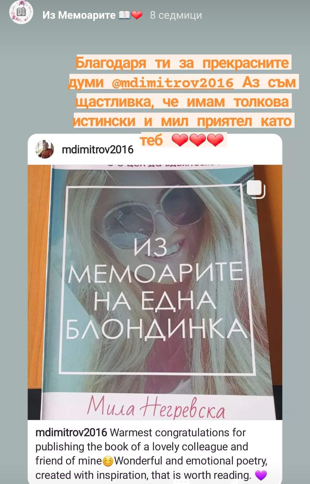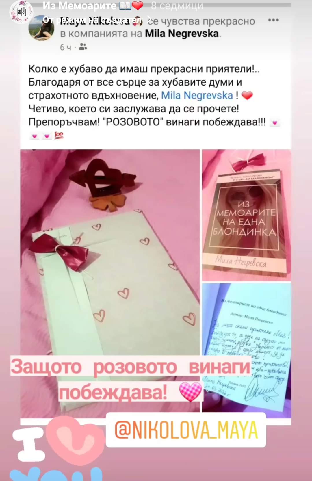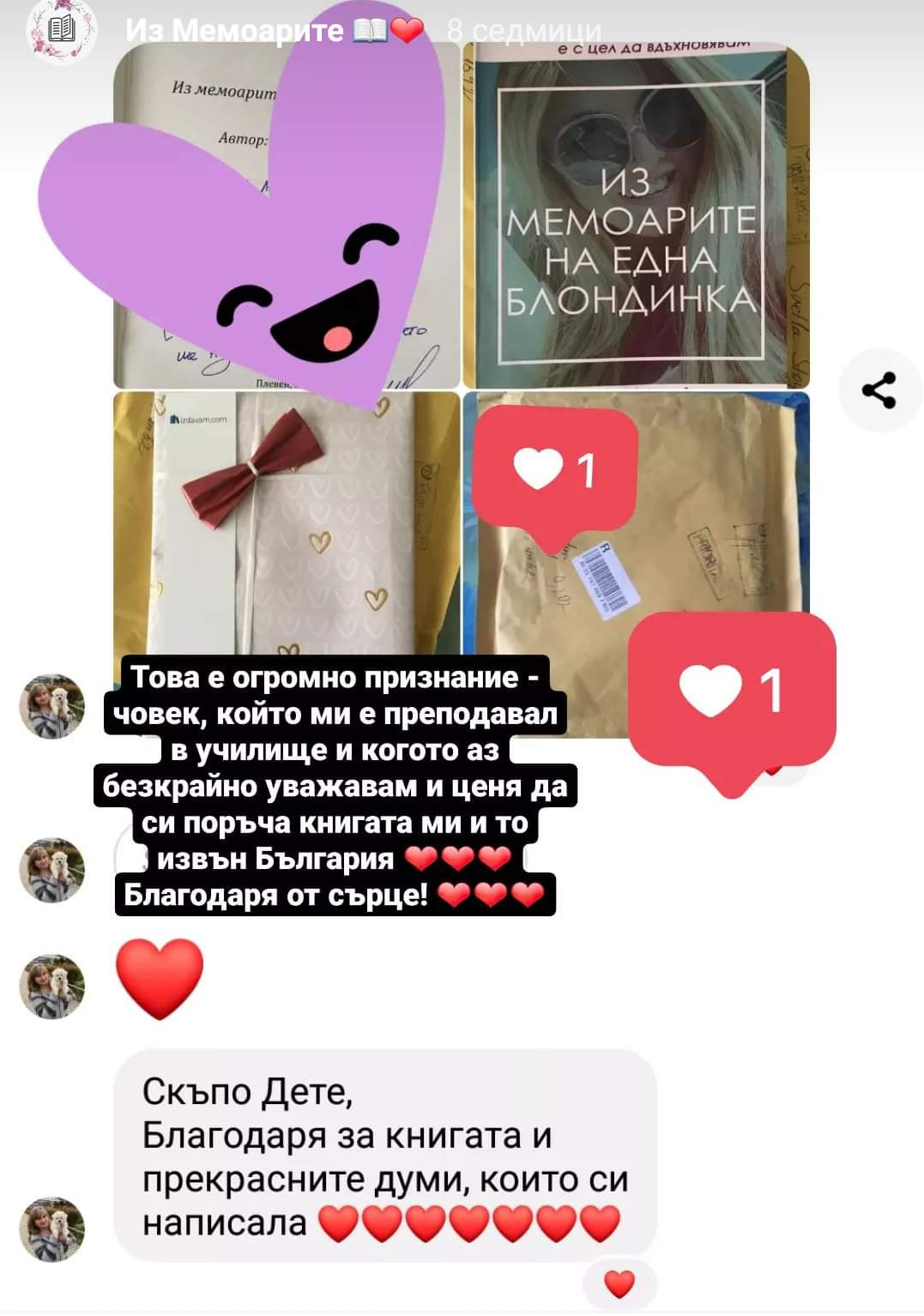 Хванах „Из мемоарите на една блондинка” в ръцете си на 11.03.2022 г. Нямах търпение, буквално тичах към ЕКОНТ, (имам видеа от този момент) когато ми пратиха смс, че имам пратка. Нямах търпение да я видя. МОЯТА КНИГА! ❤